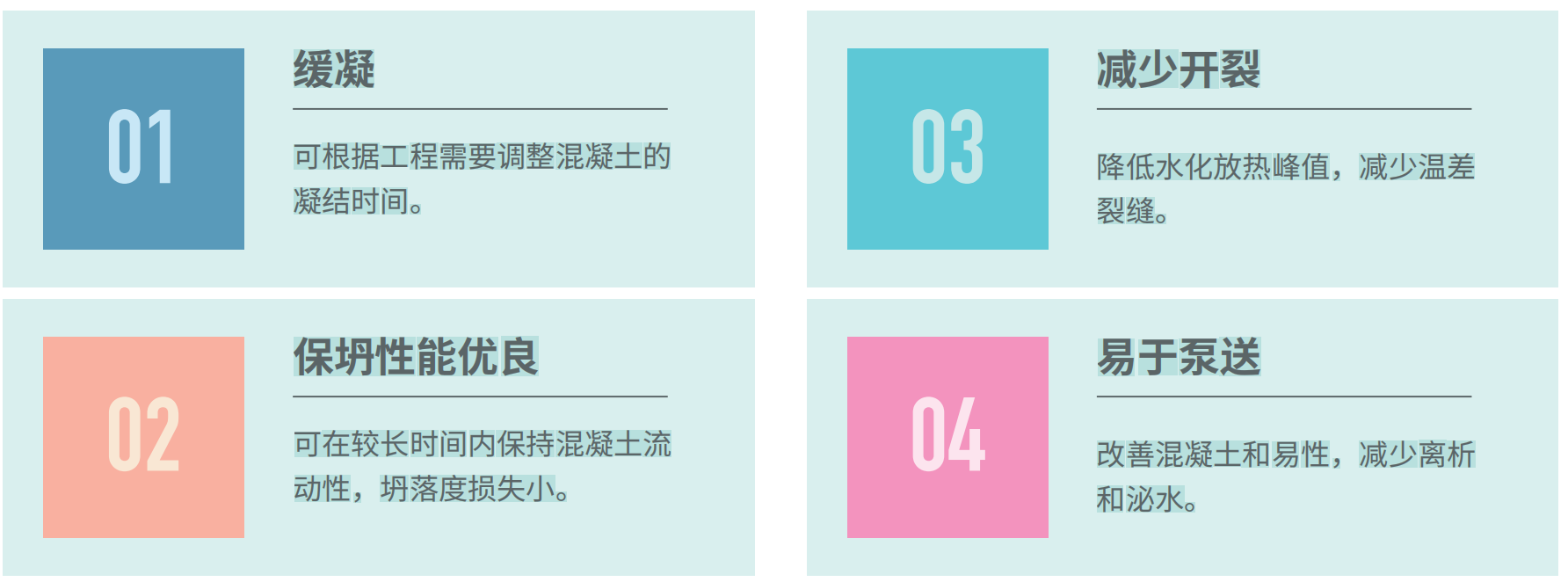 Бетон для фундамента, бетон для строительства в условиях высоких температур, дальние перевозки и насосное строительство, а также другой бетон, которому необходимо отсрочить время схватывания. Он не подходит для бетона с требованиями к ранней прочности и пропаренного бетона.