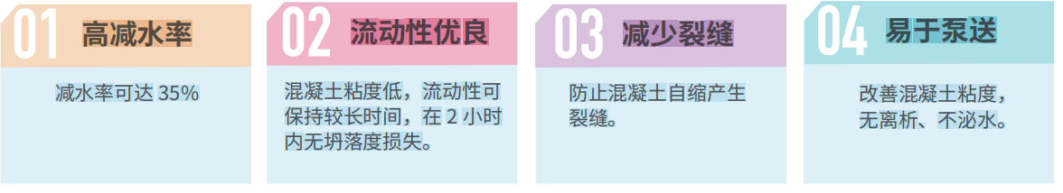 Обладает множественными эффектами, такими как высокая скорость снижения содержания воды, низкая скорость усадки и отличная текучесть. Может улучшить обрабатываемость бетона, особенно вязкость бетона, снизить вероятность образования трещин и не оказывает отрицательного влияния на прочность бетона на средней и поздней стадии.