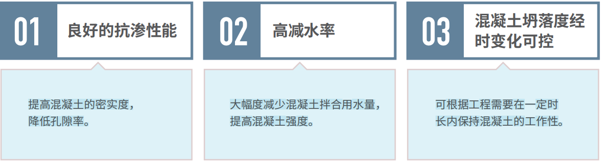 Обладает функцией противопросачивания и эффектом улучшения, улучшает производительность перекачивания бетона и не оказывает существенного влияния на время схватывания бетона.