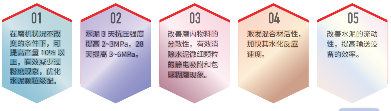 Этот продукт подходит для различных типов предприятий по производству цемента. Он может значительно улучшить прочность обычного цемента, композитного цемента, шлакового цемента, цемента из вулканического пепла, особенно цемента с высокой дозировкой известняка. В то же время, в соответствии с потребностями заказчика, время схватывания цемента можно регулировать путем регулировки соотношения добавок для помола цемента, включая продление и сокращение времени схватывания.
